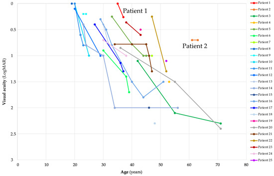 Visual acuity at last exam in patients harboring variant p.Gly47Valfs*3 (blue color) and other biallelic variants (other colors, all homozygotes are in the shades of blue) in DRAM2. Five patients had visual acuity above the 95% CI of the baseline group: Patient 1 (p.Met1? homozygous), Patient 2 (p.Met1?; p.Leu246Pro), Patient 19 (p.Gly57Arg homozygous), Patient 23 (p.Arg236_Val237insGly homozygous) and Patient 25 (c.693 + 2T > A homozygous). Note that all patients with pathogenic variant p.Gly47Valfs*3 are in the blue color. Note that the colors of the patients are the same in Figure 5, Figure 6, Figure 7 and Figure 8.