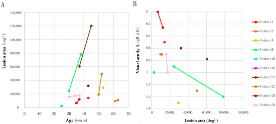 (A) The correlations between age and lesion area on fundus autofluorescence imaging. All patients with longitudinal imaging showed increases in lesion area with time. Note the relatively small lesion area size of Patient 2, harboring p.Met1? and p.Leu246Pro. (B) The correlations between lesion area and visual acuity on fundus autofluorescence imaging. Note the relatively large lesion area size and good visual acuity of Patient 21 at the age of 37 years. Visual acuity in this patient deteriorated to 1.3 LogMAR after 10 years, but his OCT images for evaluating the integrity of his photoreceptor layer are not available. On the other hand, Patient 4 had relatively small lesion area size and poor visual acuity (1.5 LogMAR). On OCT, the integrity of external limiting membrane was still preserved in this patient. Note that the colors of the patients are the same in Figure 5, Figure 6, Figure 7 and Figure 8.
