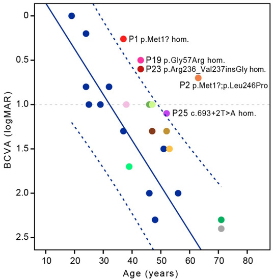 Disease onset was significantly earlier in the baseline group (median 24; range 16–28 years) than in others (median 32; range 19–59 years) (Mann–Whitney test, p < 0.05) (Figure 5). Patient 23 (p.Arg236_Val237insGly homozygous) had earlier disease onset (19 years) than the median age of the baseline group. Four patients had onset of the disease in the 4th decade: Patient 5 (p.Ala22del homozygous; 30 years), Patient 19 (p.Gly57Arg homozygous; 35 years), Patient 20 (p.Arg74His homozygous; 36 years) and Patient 21 (p.His121Leu homozygous; 34 years) (Figure 5). One patient had onset of the disease in the 5th decade (Patient 22; p.Ala210GlufsTer16 homozygous; 45 years) and one patient in the 6th decade (Patient 2; p.Met1?; p.Leu246Pro; 59 years) (Figure 5). BCVA at last exam for patients homozygous for variant Gly47Valfs*3 was worse than for other patients when corrected for age (multiple regression, p < 0.01) (Figure 8). Accounting for visual acuity decline with age, five patients had BCVA above the 95% confidence interval (CI) of the baseline group (Figure 8). They were Patient 1 (p.Met1? homozygous), Patient 2 (p.Met1?; p.Leu246Pro), Patient 19 (p.Gly57Arg homozygous), Patient 23 (p.Arg236_Val237insGly homozygous) and Patient 25 (c.693 + 2T > A homozygous). Patient 22, homozygous for the truncating variant p.Ala210GlufsTer16, had relatively good BCVA (Figure 6 and Figure 8) but was at the last exam within the 95% CI of the baseline group (Figure 8).