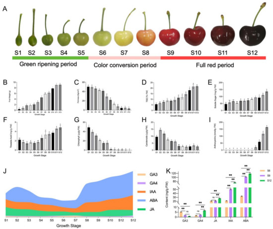 Changes in fruit quality and endogenous hormones during the development of sweet cherries. (A) Fruit growth and development status diagram; (B) single fruit weight, in which different lowercase letters indicate significant differences (p ≤ 0.05), the same below; (C) fruit firmness; (D) fruit soluble solids (TSS) content; (E) fruit soluble sugar content; (F) fruit titratable acid content; (G) fruit chlorophyll content; (H) fruit carotenoid content; (I) fruit anthocyanin content; (J) hormone profile during fruit development; (K) the specific changes in fruit endogenous hormones in the three periods of S6, S9, and S12, where ns means insignificant, and ** indicates an extremely significant correlation at the 0.01 level.