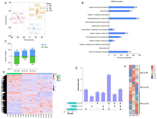 Thresholds of VIP > 1.0, difference multiplier FC > 1.2 or FC < 0.833, and p-value < 0.05 were set to screen for DEMs. Comparisons were made between combinations of different periods, and the combination with the most DEMs was S6 compared with S12 (1069 in total, 535 upregulated, and 534 downregulated). The combination with the least differences was S9 vs. S12, with only 600 DEMs (452 upregulated and 148 downregulated, Figure 2C). A heat map of the 1458 DEM hierarchical clusters screened is shown in Figure 2D, indicating significant differences between combinations. Approximately 30% of the DEMs were highly expressed at S6, 20% were highly expressed at S9, 15% were highly expressed at S12, and 45% were similarly expressed in the three periods. A comparison of the two-two combinations of the three periods is shown in Figure 2E. A total of 220 DEMs were shared among the three combinations, and the most DEMs were shared between the two combinations of S6 vs. S9 and S6 vs. S12, with a total of 477 DEMs. A total of 167 DEMs were unique to S6 vs. S9, 92 DEMs were unique to S9 vs. S12, and 214 DEMs were unique to S6 vs. S12, indicating that the material changes were more intense in the S6 and S9 periods. The changes were more drastic. The expression of DEMs specific to the three combinations is shown in Figure 2F. The expression of these DEMs differed significantly among periods.