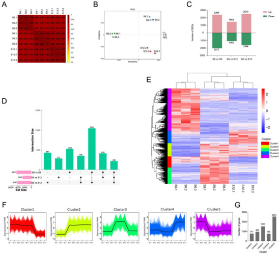 Transcriptome analysis of sweet cherries during development. (A) Spearman correlation coefficients of gene expression at different developmental stages; (B) PCA analysis of gene expression at each developmental stage; (C) the number of DEGs compared at any two different developmental stages; the number of upregulated and downregulated genes are represented by the bars above and below the x-axis, respectively; (D) upset plots of ubiquitously and exclusively expressed DEGs in pairwise comparisons across developmental stages; (E) hierarchical clustering of DEGs for all samples; (F) K-means clustering of DEGs expression trends, the expression profiles of genes in each cluster are represented in different colors, and the average expression profiles of all genes in each sample are represented in black; (G) summary of K-means clustering results, the specific number of DEGs contained in each cluster.