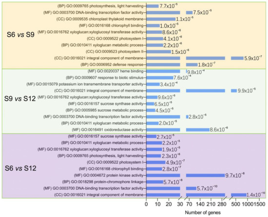 The functions of DEGs were investigated using GO enrichment analysis, and the results are shown in Figure 4. The figure shows the names of the top 10 significant GO terms belonging to the three categories—biological process, molecular function, and cellular component—in the three comparison combinations. In all three comparison groups, most DEGs were significantly enriched in CC and MF, and the MF category was more enriched, indicating that these pathways play an important role in sweet cherry development. Notably, the S6 vs. S9 and S9 vs. S12 comparative groups were enriched for sucrose synthase activity, sucrose metabolic process, and other terms related to fruit sucrose. In both the S6 vs. S9 and S6 vs. S12 comparison groups, the terms photosynthesis, photosynthesis, light-harvesting, chlorophyll-binding, photosystem I, and chloroplast thylakoid membrane were enriched. This indicates that the fruit pigments started to change during S6, with a sharp decrease in chlorophyll (Figure 1G) and a rapid accumulation of anthocyanins (Figure 1I). Based on the results of GO enrichment analysis, the DEGs associated with quality changes during sweet cherry development could be further screened.