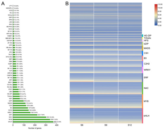 Analysis of transcription factors in different developmental stages of sweet cherries. (A) Statistical summary of transcription factor families; the number and proportion of each transcription factor family are displayed in a bar chart; (B) heat map of transcription factor expression patterns. The FPKM values of transcription factors were transformed according to log2.