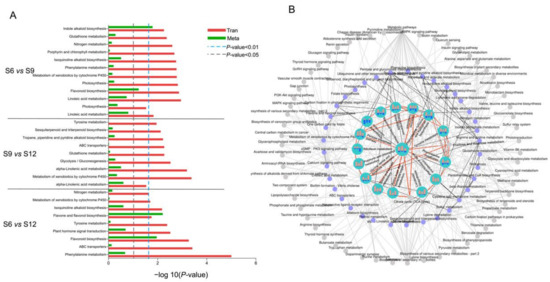 The metabolic pathways that were significantly enriched by DEGs, together with DEMs, were identified via KEGG pathway analysis. The top 10 significantly enriched metabolic pathways were mapped for each comparison group, in which 18 pathways were identified, and the results are shown in Figure 6A. In the comparison group of S6 vs. S9, pathways containing linoleic acid metabolism, flavonoid biosynthesis, indole alkaloid biosynthesis, and porphyrin and chlorophyll metabolism could be seen. Among these pathways, the enrichment of porphyrin and chlorophyll metabolism and flavonoid biosynthesis indicated that the chlorophyll in the fruit was gradually fading at this time, preparing for further conversion to anthocyanins. Moreover, the enrichment of the glycolysis/gluconeogenesis pathway was significant in the comparison group of S9 vs. S12, where glucose was gradually broken down, and a large number of precursors were produced to further promote the synthesis of anthocyanins, flavonoids, and alkaloids. Similarly, the flavone and flavonol biosynthesis, phenylalanine metabolism, and flavonoid biosynthesis pathways showed significant results in the S6 vs. S12 comparator group.