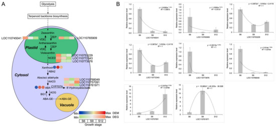 ABA synthesis pathway and gene expression analysis. (A) Schematic representation of the core pathway of ABA biosynthesis. The circle heat map represents the expression of DEMs in the three developmental stages, and the square heat map represents the expression of DEGs in the three developmental stages. (B) qRT-PCR analysis of ABA biosynthesis-related genes.