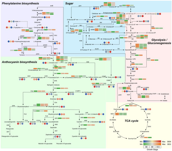 To further analyze the significantly enriched pathways, we performed detailed pathway mapping, centered on the glycolysis/gluconeogenesis pathway, which mainly included the glycolysis, glycolysis/gluconeogenesis, phenylalanine metabolism, anthocyanin biosynthesis, and citrate cycle (TCA cycle) pathways, containing 42 DEMs and 73 DEGs (Figure 8 and Table S4).