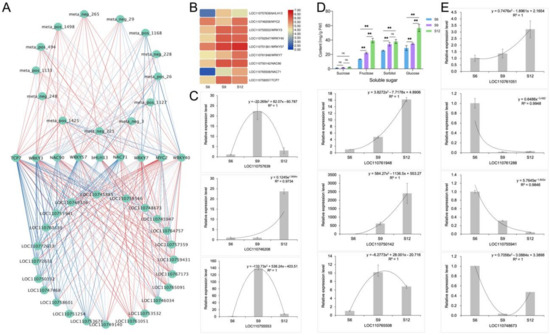 Identification and validation of glucose metabolism-related networks. (A) Correlation network identification of 9 transcription factors with DEMs and DEGs related to sugar anabolism. Correlations are represented by blue and red lines from low to high. (B) Expression patterns of 9 transcription factors, transformed according to log2 to FPKM values of transcription factors, with colors indicating the relative content of each transcription factor, from low (blue) to high (red). (C) qRT-PCR analysis of 6 transcription factors. (D) Composition and content of soluble sugars in different developmental stages of sweet cherries. ns means not significant, ** means extremely significant correlation at the 0.01 level; (E) qRT-PCR analysis of four sugar anabolic genes.