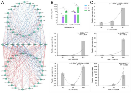 Identification and validation of anthocyanin synthesis correlation network. (A) Correlation network identification of 9 transcription factors and anthocyanin synthesis-related DEMs and DEGs. Correlations are represented by blue and red lines from low to high. (B) Composition and content of anthocyanins in different developmental stages of sweet cherries. ns means not significant, * indicates significant correlation at the 0.05 level, ** indicates extremely significant correlation at the 0.01 level; (C) qRT-PCR analysis of 5 anthocyanin synthesis-related genes.