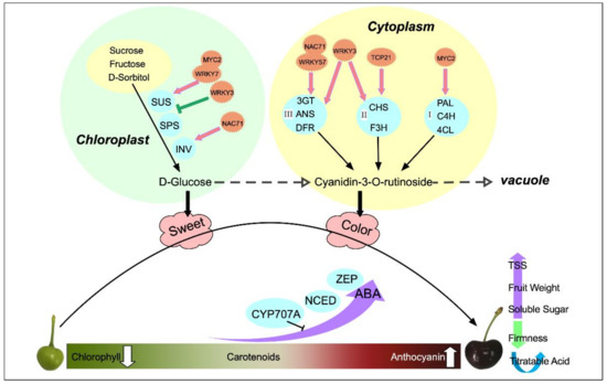 Fruit development and ripening is a very complex physiological and biochemical process, which involves a series of physiological and biochemical changes, including changes in fruit inclusions, synthesis, the decomposition of hormones, color, and other metabolic changes. During fruit development, the ripening process is important, and this stage determines the commercial value of the fruit. Moreover, the size, color, and flavor of the fruit in this stage are significant. Similarly to many drupes such as peaches and plums, sweet cherry fruit development follows a double ‘S’ growth pattern [22]. In the present study, the characteristics of single fruit weight and TSS, soluble sugars, and anthocyanin contents of sweet cherry fruit increased continuously with fruit development; their main change stages mainly occurred after color conversion periods; and their growth changes exhibited a double ‘S’ change pattern. Its specific change mode mechanism is shown in Figure 11.