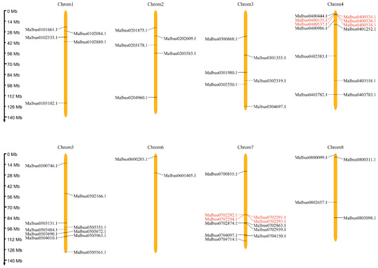Chromosomal distribution and position of 55 MaGRAS genes identified in the M. albus genome. Eight chromosomes are indicated in orange columns, and black lines indicate the position of each MaGRAS genes. Red lines represent the tandemly duplicated genes.