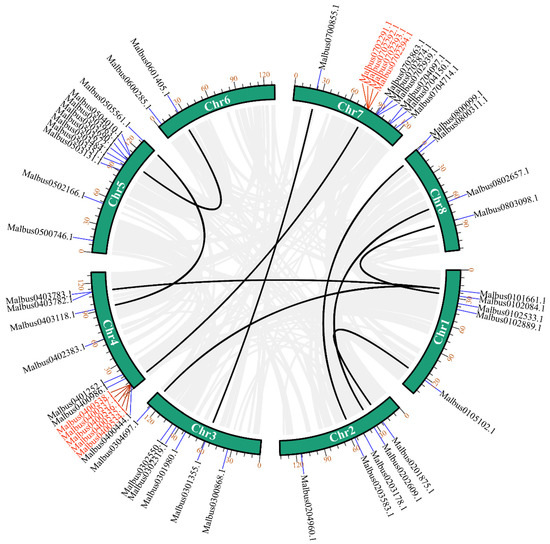 Distribution and synteny analysis of MaGRAS genes. In the figure, the 8 M. albus chromosomes are shown in green–colored partial circles, gene IDs are indicated at the top of each bar. Background gray lines indicate all M. albus genome synteny blocks, black lines indicate the duplicated MaGRAS genes, red lines represent the tandemly duplicated MaGRAS genes.