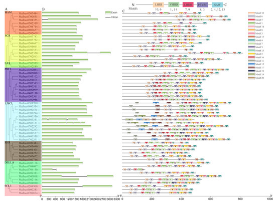Exon–intron structure and distribution of conserved motifs of MaGRAS genes in M. albus: (A), MaGRAS proteins are categorized into 8 subfamilies, which are classified and labeled with different colors, including LISCL, SHR, PAT1, LAS, HAM, DELLA, SCR, and SCL3; (B), exon–intron structures of MaGRAS genes. Intron indicated by black line and CDS exon indicated by green boxes; (C), schematic diagram of the conserved motifs in the MaGRAS proteins. Each motif is represented by a number in the colored box. The black lines represent the non–conserved sequences. A total of 5 conserved domains and corresponding motifs in the GRAS proteins sequences are shown at the top. A scale of gene and protein length is shown at the bottom.