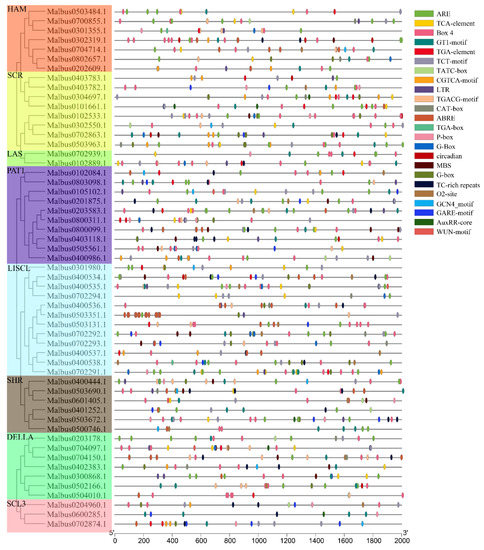 The cis–acting elements of promoter sequences (−2000 bp) of 55 MaGRAS genes are analyzed by PlantCARE in M. albus.