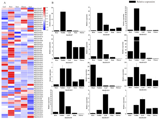 In addition, we performed qRT–PCR analysis of 12 MaGRAS genes in 5 tissues (leaf, root, stem, flower and nodule tissues) during the flowering stage of M. albus (Figure 6B). The qRT–PCR results had similar trends to transcriptome data. MaGRAS7, MaGRAS8, MaGRAS12, MaGRAS19, MaGRAS29, MaGRAS36 and MaGRAS38 were significantly more highly expressed in nodules than in other tissues. The expression of MaGRAS17 in leaves, stems and flowers were significantly higher than those in roots and nodules. MaGRAS33 was highly expressed in leaves and nodules, but the lowest in leaves. MaGRAS34 had the highest expression in roots, followed by in nodules. MaGRAS47 and MaGRAS48 were more highly expressed in leaves.