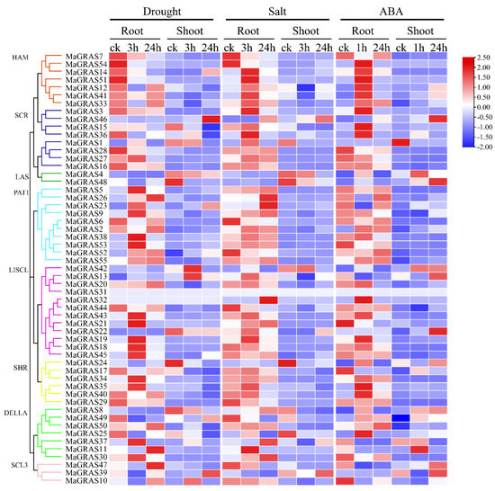 Expression of 55 MaGRAS genes in response to drought, salt and ABA treatments. Data were retrieved from transcriptome datasets, and the clustering was performed using TBtools. The heat map shows the relative transcript level of MaGRAS genes under drought, salt and ABA stresses. The expression values (FPKM) were normalized.