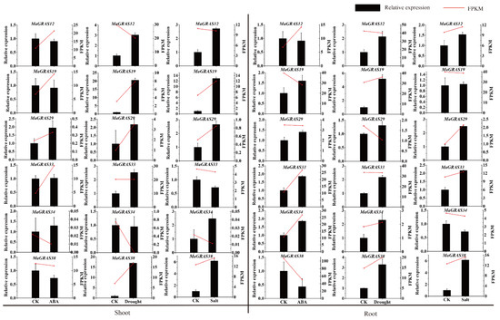 In addition, in order to further verify the RNA–Seq data, six MaGRAS genes responding to ABA, drought and salt stresses were selected for qRT–PCR validation. The expression trends of most MaGRAS genes tested are consistent with the results of RNA–Seq analysis (Figure 8). Most of the tested genes were up–regulated under drought, salt and ABA stresses, indicating that they were positive regulatory genes, for example, MaGRAS19 and MaGRAS29 were upregulated in shoots and roots under drought and salt stresses, but MaGRAS38 was downregulated in shoots and roots under ABA stress, which was similar to the RNA–Seq analysis results. These results indicated that MaGRAS genes play an important regulatory role in dealing with drought, salt stresses and ABA treatment.