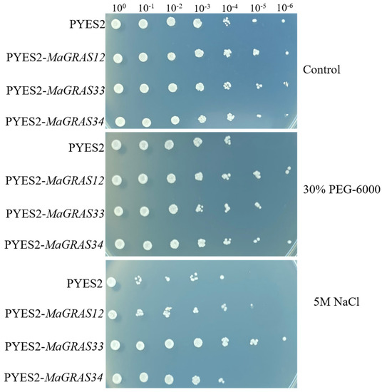 The results of qRT–PCR showed that the expression levels of MaGRAS12, MaGRAS33 and MaGRAS34 were upregulated under drought and salt stress. In order to further verify the functions, the drought and salt tolerance functions of these genes were discussed by yeast heterologous expression analysis (Figure 9). The results showed that transgenic yeast cells of three MaGRAS genes and yeast cells transformed with empty vectors grew well and no difference under the control treatment. Meanwhile, we observed that the yeast cells transformed with MaGRAS12 and MaGRAS34 genes showed significant tolerance under 30% PEG–6000 treatments, especially under 100,000 times dilution, and the yeast cells transformed with the MaGRAS33 gene showed drought and salt tolerance under 100,000 times dilution. We observed that the yeast cells transformed with MaGRAS33 gene showed significant tolerance under 5 M NaCl treatment, especially under 1,000,000 times dilution; followed by the MaGRAS12, the MaGRAS34 transformed yeast cells had no difference with the control.