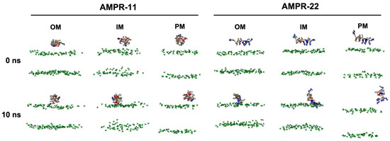AMPR-11/22 interactions with Gram-negative bacterial outer membrane (OM), inner membrane (IM), or eukaryotic plasma membrane (PM). Each iteration having the average value of the hydrogen bonds formed between AMPR-11/22 and the membrane was selected: 25th (OM), 43rd (IM), and 43rd (PM) simulations from 100 iterations were selected for AMPR-11, and 1st (OM), 42nd (IM), and 48th (PM) simulations from 100 iterations were selected for AMPR-22. The phosphate group of the lipids is colored green. Hydrophobic (nonpolar), hydrophilic (polar), and cationic residues of AMPR-11/22 are shown in copper, red, and blue, respectively.