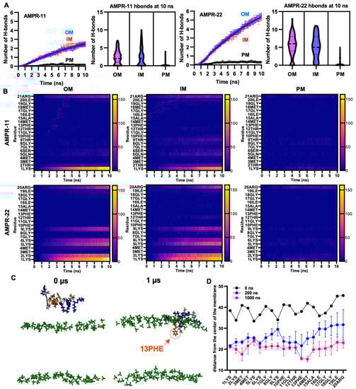 We selected one of the iterations for AMPR-22 (42nd simulation of 100 iterations for inner membrane) that could represent an average number of hydrogen bonds and simulated it for 1 µs. Membrane stability was monitored via tracking area per lipid and membrane thickness by time (Figure S2). Although we were not able to see the penetration of AMPR-22 into the bacterial inner/outer membranes in three iterations, 13PHE and 14MET were inserted deeply into the membrane compared to other residues over time (Figure 3C,D). This result is consistent with the report showing that antimicrobial activity was significantly decreased or lost if 13PHE was deleted from AMPR-11 [20]. Additionally, we performed a coarse-grained (CG) simulation for 1 ms by placing nine AMPR-22 onto the bacterial inner membrane parallelly under a martini22p force field to determine penetration and/or pore formation events. However, neither penetration of AMPR-22 nor pore formation was detected in three iterations (Figure S3). The results may imply that penetration could occur at a later stage than believed (e.g., multi-ms to multi-s).