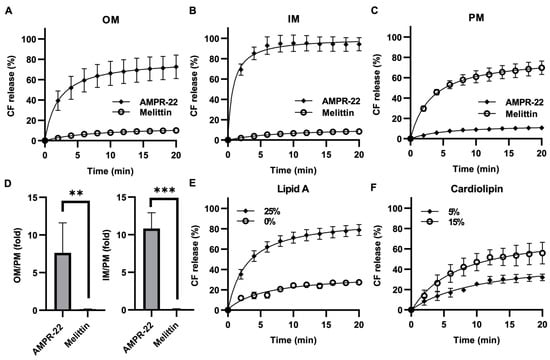 AMPR-22-induced membrane permeabilization. CF-encapsulated OM-LUVs (A), IM-LUVs (B), or PM-LUVs (C) were constructed using the lipid composition used for MD. The LUVs were incubated with 0.1% HFIP (negative control), 1% Triton X-100 (positive control), 2 μM AMPR-22, or 0.05 μM Melittin. (D) The membrane permeabilization of OM-LUVs (left panel) or IM-LUVs (right panel) was divided by that of PM-LUVs, representing the membrane preference of AMPR-22. Membrane permeabilization of OM-LUVs with additional lipid A (E) or IM-LUVs with additional cardiolipin (F). Bars represent average ± standard deviation of three independent experiments. ** p < 0.01, *** p < 0.001 by unpaired t tests.