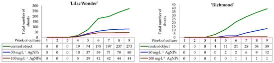 As for ‘Richmond’, successive and moderately intensive formation of shoots on the control explants continued until the end of culture and reached 39 shoots. Moreover, in this combination, the highest number of shoots was found, whereas only 12 shoots and 1 shoot were reported for 50 mg·L−1 and 100 mg·L−1 AgNPs treatments, respectively, in the ninth week. When silver nanoparticles were applied at the concentration of 50 mg·L−1, most of the shoots appeared between the sixth and ninth week of culture. In 100 mg·L−1 AgNPs treatment, the emergence of one shoot was noticed in the sixth week (Figure 1).