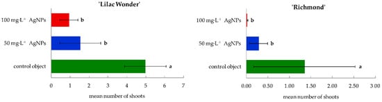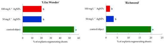 The shoot induction rate of ‘Lilac Wonder’ explants amounted to 55% in the control object and was reduced to 20% after the application of silver nanoparticles at the concentration of both 50 mg·L−1 and 100 mg·L−1. Similarly, AgNPs treatment also decreased the rate of ‘Richmond’ leaf explants forming shoots from 20% in the control object to only 1.67% in 100 mg·L−1 AgNPs treatment (Figure 2).