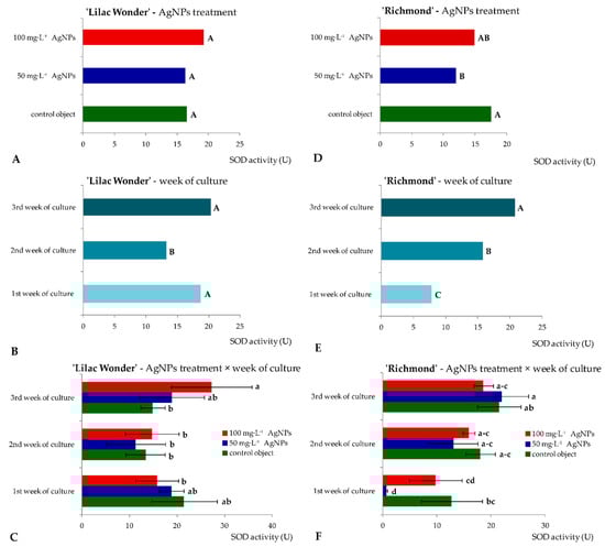 Activity of superoxide dismutase in Chrysanthemum × grandiflorum ‘Lilac Wonder’ (graphs A–C) and ‘Richmond’ (graphs D–F) leaf explants cultured in vitro on the modified MS medium with 0.6 mg·L−1 BAP and 2 mg·L−1 IAA, depending on the AgNPs treatment (0–100 mg·L−1) and week of culture (first–third). Means and means ± SD on graphs for each cultivar tested followed by the same letter do not differ significantly at p ≤ 0.05 (Tukey’s test). Upper-case letters refer to the main effects (irrespectively) (graphs A,B,D,F), lower-case letters refer to the interaction between the two studied independent variables (graphs C,F).