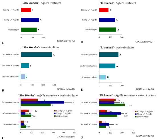 Activity of guaiacol peroxidase in Chrysanthemum × grandiflorum ‘Lilac Wonder’ (graphs A–C) and ‘Richmond’ (graphs D–F) leaf explants cultured in vitro on the modified MS medium with 0.6 mg·L−1 BAP and 2 mg·L−1 IAA, depending on the AgNPs treatment (0–100 mg·L−1) and week of culture (first–third). Means and means ± SD on graphs for each cultivar tested followed by the same letter do not differ significantly at p ≤ 0.05 (Tukey’s test). Upper-case letters refer to the main effects (irrespectively) (graphs A,B,D,F), lower-case letters refer to the interaction between the two studied independent variables (graphs C,F).