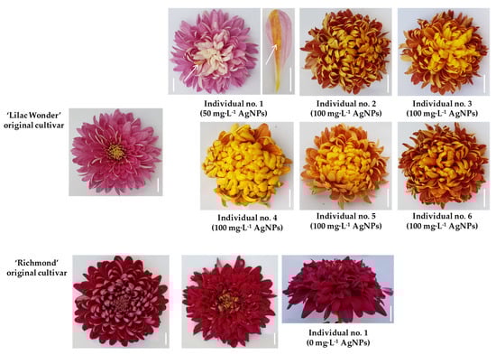 Chrysanthemum× grandiflorum ‘Lilac Wonder’ and ‘Richmond’ and their mutants, created as a result of AgNPs treatment (0–100 mg·L−1); arrows indicate a chimeric structure of the ligulate floret; bar = 1 cm.