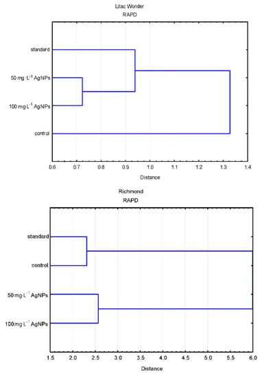 According to the RAPD analysis of the cultivar ‘Richmond’, two clusters could be distinguished. The first cluster comprised the control and standard populations, while the second cluster contained AgNPs-treated plants. As for the SCoT fingerprinting, two clusters were also recognized, but the first one included the standard and 100 mg·L−1 AgNPs-derived plants, while the other—control and 50 mg·L−1 AgNPs-treated populations (Figure 7).