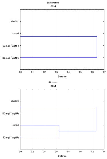 As for the cultivar ‘Richmond’, four groups were distinguished by the RAPDs, with five plants (representing three genotypes) obtained as a result of 50 mg·L−1 AgNPs treatment being the most distant from the predominant standard. Based on the SCoT analysis, three major groups of plants could be distinguished, with six genotypes (12 plants) from the control and 50 mg·L−1 AgNPs objects significantly different from the standard.