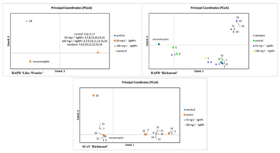 Graphs of principal coordinates analysis (PCoA) of Chrysanthemum × grandiflorum ‘Lilac Wonder’ and ‘Richmond’ plants obtained after 0 (control), 50, and 100 mg·L−1 AgNPs treatment and in standard plants, based on randomly amplified polymorphic DNA (RAPD) and start codon targeted polymorphism (SCoT) analyses. Plants representing the same band pattern as the predominant standard are collected within a single group named ‘monomorphic’.