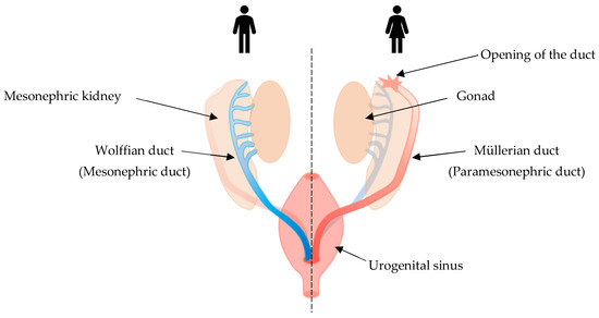 - Wilson, D.; Bordoni, B. Embryology, Mullerian Ducts (Paramesonephric Ducts). In StatPearls; StatPearls Publishing: Tampa, FL, USA, 2022. [Google Scholar]