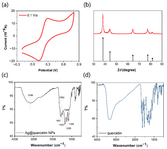 Structural characterization of QC and Ag@QCNPs. (a) Cyclic voltammogram of QC; (b) XRD spectrum of Ag@QCNPs (red) and standard of silver crystallite (black); FT-IR spectra of (c) Ag@QCNPs and (d) QC.