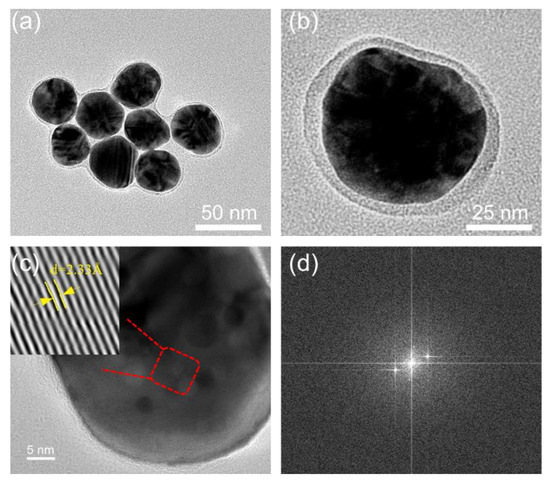 TEM images showed that the Ag@QCNPs nanoparticles have a very obvious core–shell structure (Figure 2a,b). The silver core has a diameter of ~35 nm and is completely surrounded by a shell of QC. The high-resolution TEM image of an individual particle (Figure 2c) showed that the center of the nanoparticles is silver, with the crystal grain neatly arranged with a lattice spacing of 2.33 Å. The diffraction of the crystal can be seen from fast Fourier transform of the high-resolution TEM image (Figure 2d).