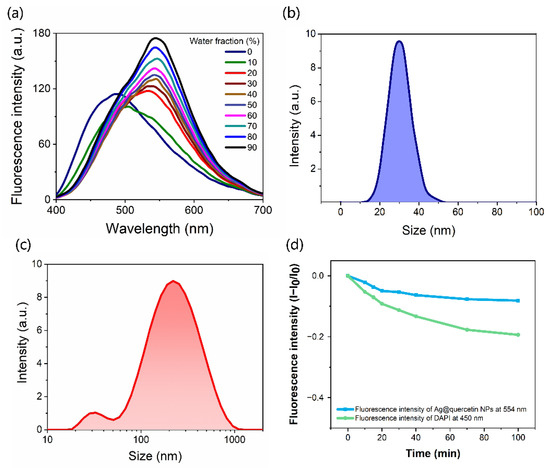 Fluorescence and particle size of Ag@QCNPs. (a) Fluorescence spectra of Ag@QCNPs (10 μg/mL) in mixtures of THF and water (excitation wavelength = 370 nm); (b) DLS profile of Ag@QCNPs in THF; (c) DLS profile of Ag@QCNPs in THF/water (9:1 v:v); (d) Changes in intensity of maximum fluorescence emission of Ag@QCNPs (554 nm) and DAPI (450 nm) during irradiation with ultraviolet light.
