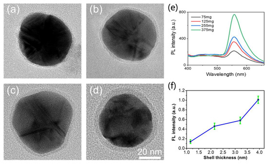 The effect of the amount of QC in the Ag@QCNPs on their morphology was characterized by TEM. The shell thickness and fluorescence properties of the Ag@QCNPs could be adjusted by altering the amount of QC available for the redox reaction. Regardless of the amount of QC used in their preparation, all of the Ag@QCNPs were essentially spherical in shape (Figure 4a–d). When the amount of QC in the reaction mixture was increased from 75 mg to 375 mg, the thickness of the shell increased 4-fold to ~4 nm, the corresponding statistic shell thickness: 1.16 ± 0.21 nm (n = 124), 2.15 ± 0.26 nm (n = 133), 3.21 ± 0.31 nm (n = 120), and 3.95 ± 0.37 nm (n = 112). The fluorescence intensity of the Ag@QCNPs increased as the shell thickness of QC in the reaction mixture was increased (Figure 4e,f), showing that both the size and optical properties of the Ag@QCNPs can be adjusted by varying the reaction conditions.