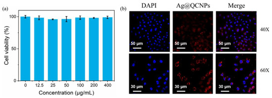 The MTT assay was used to determine whether the Ag@QCNPs show cytotoxicity. Human colorectal adenocarcinoma (HT-29) cells showed high survival (>95%) after incubating with concentrations of Ag@QCNPs as high as 400 μg/mL for 24 h (Figure 5a). Cell staining was investigated using HeLa cells. After co-incubating for 60 min with Ag@QCNPs (100 μg/mL), the nuclei of the cells were stained with DAPI. Images captured by confocal laser scanning microscopy (CLSM) clearly show that DAPI easily crosses the nuclear membrane to label DNA, whereas Ag@QCNPs are retained in the cytoplasm (Figure 5b). The merged images thus clearly show the entire cells.