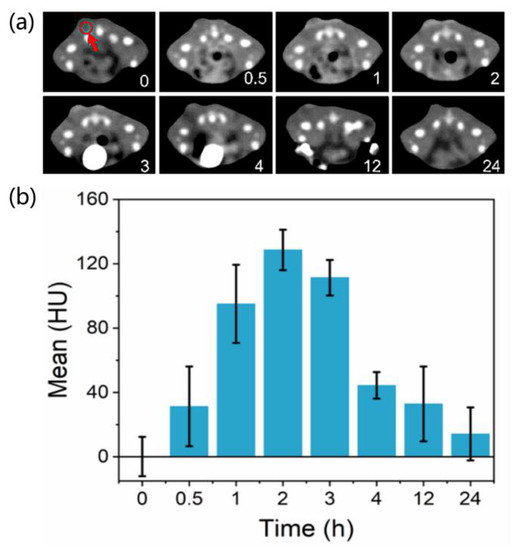 Six-week-old BALB/c nude mice were used to test the potential of Ag@QCNPs for CT imaging in vivo. Tumors were established by subcutaneous injection of S180 sarcoma cells into the left hips of the mice. Ag@QCNPs (1 mg/mL, 200 μL) were then injected via the tail vein and the intensities of the CT signals of the tumors in the left hips of the mice were recorded at different time intervals. Cross sections of the buttocks of one mouse, with the location of the tumor marked in red, are shown in Figure 6a. The CT signal intensities of the tumor site 0.5, 1, 2, 3, 4, 12 and 24 h after injection of the Ag@QCNPs are shown in Figure 6b. The accumulation of Ag@QCNPs in the tumor site was highest (128.6 HU) 2 h after injection, and then decreased gradually over the following 10 h.