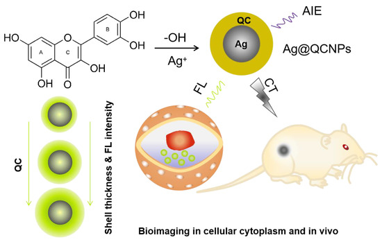 QC, which is found in many plants, is a very cheap natural raw material. We prepared Ag@QCNPs, which have a particle size of ~35 nm and a clear core–shell structure, by redox reaction of QC and silver ions. Ag@QCNPs show strong AIE, which can be tuned by altering the thickness of the QC shell, good resistance to photobleaching and good biocompatibility. The Ag@QCNPs were successfully used for both in vitro and in vivo imaging, indicating that they have the potential for clinical application.