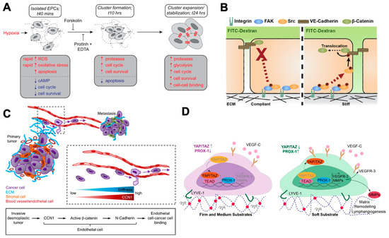 Engineered hydrogels for elucidating the molecular mechanisms of ECs in pathological microenvironments. (A). Hypoxia results in rapid ROS accumulation and triggers cAMP downregulation to protect the cells from oxidative stress. Protease upregulation facilitates ECM degradation and initial cluster formation. At later time points, ECFC clusters are stabilized through increased cell–cell adhesion and upregulation of carbohydrate metabolism. The schematic was adapted from [75]. (B). ECM stiffness modulates endothelial adherens junctions’ integrity. Activation of FAK on stiff matrices promotes the translocation of phosphorylated Src to the adherens junctions, triggering the dissociation of β-catenin and subsequently disrupting the endothelial barrier. Reprinted/adapted with permission from [90] 2022, John Wiley and Sons. (C). Enhanced tumor stiffness upregulates the expression of CCN1 in ECs. CCN1 mediates an N-cadherin expression in a β-catenin-mediated fashion, while the N-cadherin expression promotes the adhesion of cancer cells to the vascular endothelium. The schematic was adapted from [91]. (D). YAP/TAZ modulates lymphangiogenesis on different substrate stiffnesses. On stiff substrates, YAP/TAZ binds to the PROX-1 promoter, ultimately inhibiting the transcription of the PROX-1 targets VEGFR-3 and MMPs. LECs cultured on compliant substrates facilitate the cytoplasmic translocation and subsequent degradation of YAP/TAZ. An increased expression of VEGFR-3 and MMPs leads to enhanced ECM remodeling and lymphatic tube formation. Reprinted/adapted with permission from [98] 2022, John Wiley and Sons.