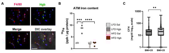 Fine-tuned control of tissue iron concentrations is pivotal for optimal function, with iron overload being considered particularly detrimental due to ferrotoxic damage []. Macrophages, which are the main iron cycling cells [,], are already resident and ubiquitous in adipose tissue and rapidly increase in number with obesity [,]. Therefore, it is plausible that macrophages in adipose tissue play a role in modulating adipose tissue iron concentrations in lean and obese conditions. Our own published data support this [,]. We discovered a specialized population of alternatively activated tissue resident ATMs with a high iron handling capacity (MFehi) from lean mice that could be sorted due to magnetic pull. We found that, during obesity, as the adipocytes became iron loaded, these MFehi ATMs became more inflammatory, lost expression of a number of iron-related genes, and were replaced by low-capacity MFelo ATMs. Additionally, all ATMs recruited during obesity were MFelo. The actions of infiltrating metabolically activated ATMs mediate much of the maladaptation associated with obesity. Therefore, we focused our current work on understanding how iron is regulated in this macrophage type with the eventual goal of understanding whether dysregulation at this node would explain how adipocytes becomes iron overloaded in obesity.