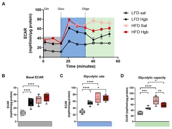 Bioenergetic shifts in response to iron in obese adipose tissue macrophages. Mice were fed low-fat (LFD) or high-fat (HFD) diets for 20 weeks. At week 19–20 of dietary challenge, mice were injected with either saline (Sal) or hemoglobin (Hgb). Adipose tissue macrophages (ATMs) were isolated using F4/80+ magnetic beads. (A) Extracellular acidification rate (ECAR) was measured by extracellular flux analysis in a modified mitochondrial stress test. Mitochondrial respiratory rates were calculated from extracellular flux analysis rates, as described in the Methods section. (B) Basal ECAR. (C) Glycolytic rate. (D) Glycolytic capcity. Statistics were performed using two-way ANOVA with Tukey’s multiple comparison post-hoc tests. * p < 0.05, ** p < 0.01, *** p < 0.001, **** p < 0.0001.