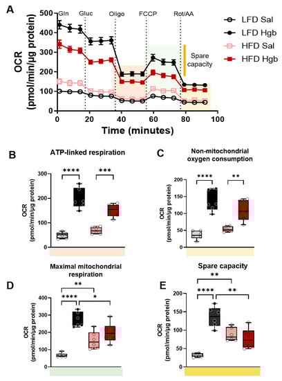 Bioenergetic shifts in response to iron in obese adipose tissue macrophages. Mice were fed a low-fat (LFD) or high-fat (HFD) diet for 20 weeks. At week 19–20 of dietary challenge, mice were injected with either saline (Sal) or hemoglobin (Hgb). Adipose tissue macrophages (ATMs) were isolated via F4/80+ magnetic beads. Mitochondrial respiratory rates were calculated from extracellular flux analysis rates, as described in the Methods section. (A) Oxygen consumption rate (OCR) was measured using a modified mitochondrial stress test. (B) ATP-linked respiration. (C) Non-mitochondrial oxygen consumption. (D) Maximal mitochondrial respiration. € Spare capacity. Statistics were performed using two-way ANOVA with Tukey’s multiple comparison post-hoc tests. * p < 0.05, ** p < 0.01, *** p < 0.001, **** p < 0.0001.