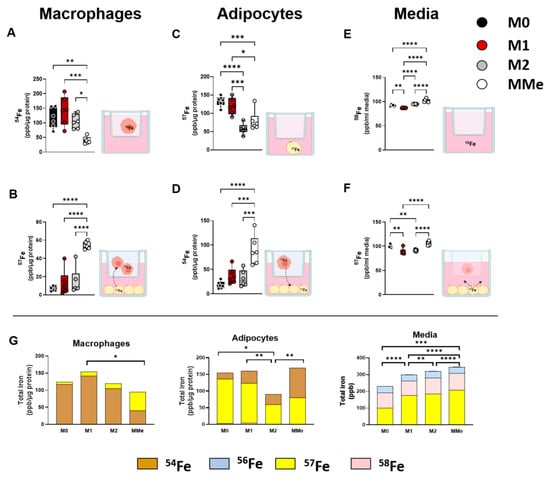 Almost no 58Fe from the media was taken up by the macrophages or the adipocytes in the co-culture system (data not shown). 58Fe remaining in the media was significantly different based upon the polarization state of the macrophages (Figure 6E), although these differences were quantitatively much lower than those in the macrophages and adipocytes. Concerning efflux of iron from macrophages and adipocytes to the media, adipocytes contributed some amount of 57Fe to the surrounding media, and the highest contribution came from adipocytes co-cultured with MMe macrophages as opposed to those co-cultured with M1 and M2 macrophages (Figure 6F). There was no 54Fe (from macrophages) detected in the media (data not shown).