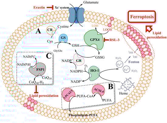 Pathways involved in ferroptotic cell death. (A) The cysteine-GSH-GPX4 system plays a central role in the cellular antioxidant mechanism and ferroptosis prevention. Inhibition of the Xc- system by erastin deprives the cells of cysteine, thus depriving them of GSH, triggering ferroptosis. Inhibition of GPX4 by RSL3 deprives the cells from the enzyme that reduces phospholipid peroxides (LOOH) to their corresponding alcohols (LOH), increasing lipid peroxidation and associated ferroptosis. Both erastin and RSL3 have been extensively used to induce ferroptosis in cell culture models. (B) The enzyme acyl-CoA synthetase long-chain family member 4 (ACSL4) activates highly oxidizable PUFAs, which is a critical step in their incorporation into phospholipids and into the cell membrane. Depleting the cells of ACSL4 increases the cellular resistance to ferroptosis. LPCAT3 catalyzes the incorporation of PUFA-CoA into phospholipids. Suppressing LPCAT3 activity increases resistance to ferroptosis. (C) FSP1 catalyzes the regeneration of CoQ10 at the expense of NAD(P)H. CoQ10-H2 (reduced form) is an effective lipid-soluble antioxidant, acting by directly reacting with free radical species in the membrane and preventing lipid peroxidation. CR, cystine reductase; GS, glutathione synthetase; GSH, reduced glutathione; GSSG, glutathione disulfide; GR, glutathione reductase; FSP-1, ferroptosis suppressor protein 1; CoQ10, coenzyme Q10; HO-1, heme oxygenase 1; LPCAT3, lysophosphatidylcholine acyltransferase 3; PUFA, polyunsaturated fatty acid.