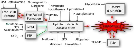 The role of TLR4 in ferroptosis is complex. Although ferroptotic regulation of 4-HNE and oxidized phospholipids results in activation of TLR4 and subsequent induction of proinflammatory cytokines through NF-κB activation [], it has also been hypothesized that neonatal HIBI increases ferroptosis by direct activation of TLR4. To support this hypothesis, Zhu, et al. demonstrated that HIBI increased TLR4 expression, and inhibition of TLR4 using TAK-242 resulted in decreased hippocampal expression of ferroptosis-related genes ATP5G3, PTGS2, CS, IREB2, and RPL8, and increased SLC7A11 and GPX4 in both cell culture and rat models of neonatal HIBI []. These data suggest that, at least in neonatal HIBI, TLR4 may also provide upstream regulation of ferroptosis in addition to being upregulated downstream from ferroptosis.