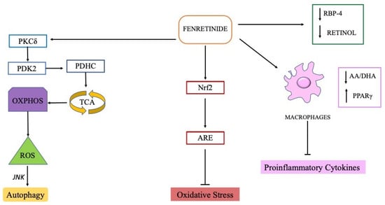 Schematic diagram of fenretinide activity in neurological diseases. Pointed arrows represent pathway activation, and blunt arrows represent pathway inhibition. Fenretinide activates PKCδ in the mitochondrial signalosome with consequent activation of PDK2, PDHC, TCA and increased ROS production. Low doses of fenretinide induce a moderate increase of intracellular ROS with activation of JNK autophagy pathway. Fenretinide decreases oxidative stress by improving the expression of the transcription factor Nrf2 that promotes the transcription of the antioxidant responsive element (ARE). Fenretinide downregulates the production of proinflammatory cytokines in macrophages by decreasing the AA/DHA ratio and enhancing the expression of PPARγ. Fenretinide binds RBP4 in place of retinol thereby decreasing circulating levels of both retinol and RBP4.