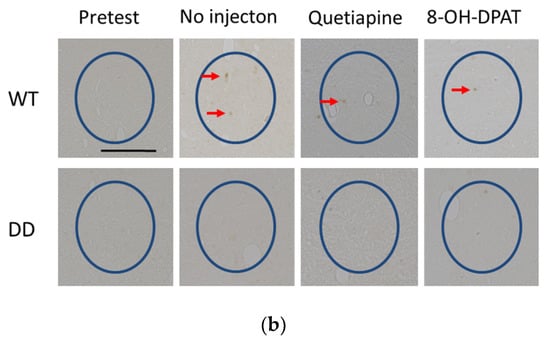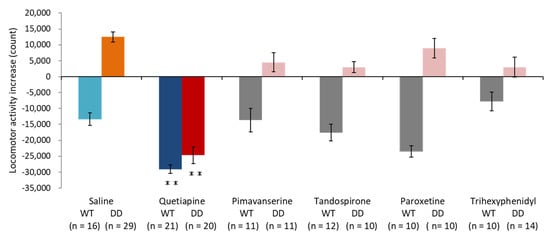 We first examined the effects of drugs on hyperlocomotion in DD mice. To induce hyperactivity, DD mice with brain dopamine levels that were below the limit of detection were placed in a novel environment, and locomotor activity was recorded for 3 h. The mice were then injected with saline, 20 mg/kg quetiapine, pimavanserin, tandospirone, paroxetine, or trihexyphenidyl, and locomotor activity was continuously recorded for another 3 h. We calculated locomotor activity by subtracting locomotor activity counts that were measured in the first 3 h (before drug administration) from locomotor activity counts that were measured in the second 3 h (after drug administration; Figure 1). Negative numbers and positive numbers indicated a decrease and increase, respectively, in locomotor activity in the second 3 h. Locomotor activity decreased because of environmental habituation in the second 3 h in saline-treated wildtype (WT) mice. Saline-treated DD mice exhibited hyperlocomotion. These results are consistent with our previous study []. We found that quetiapine suppressed locomotor activity in both WT and DD mice. The other drugs, including pimavanserin, tandospirone, paroxetine, and trihexyphenidyl, did not significantly affect locomotor activity in either WT or DD mice. The time course of locomotor activity in saline- and 20 mg/kg quetiapine-treated mice indicated that quetiapine significantly suppressed locomotor activity in both WT and DD mice beginning 20 min after administration until the end of the test. Data for quetiapine doses of 10, 40, and 80 mg/kg are included in the Supplementary Materials (Figures S1a,b–S3a,b). The transient increase in activity in WT mice just prior to drug administration may be attributable to the fact that the mice may have detected that the researchers had entered the laboratory and administered the drugs to the other mice. The increase in activity immediately after drug administration may be attributable to the pain of the injection. Conversely, in DD mice, excitation was transiently suppressed immediately after drug administration (Figure 2a,b).